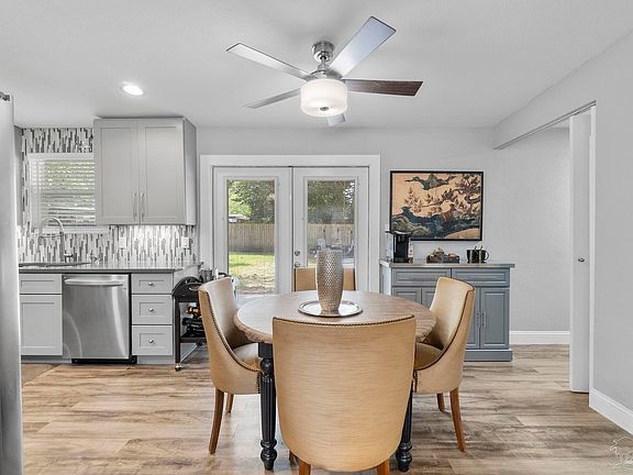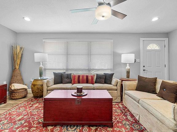 Welcome to this sanctuary you will want to call your next home. Totally renovated in 2020, you'll find all the features of home sweet home here with its high-end, quality upgrades throughout and attention to detail! Throughout this carpet free home you'll find luxury vinyl plank flooring, fresh wall and ceiling paint, 5.25" baseboards, rocker switches for all lights and dimmers in the family room, kitchen, and bath, remote controls for all fans, and outlets with USB connections in each room. Stepping inside you're greeted by the generous family room, awash in bright natural and with recessed lights for evening or cloudy days. This area opens to the dining area which offers a portable, coordinating kitchen island, complete with drawers and metal countertop, while the adjacent kitchen is a cook's dream, with an LG stainless gas range with double oven; other LG appliances that convey include the dishwasher and refrigerator. The real wood cabinets have deep and wide drawers and cabinets with the soft close feature and brushed nickel hardware. The quartz countertops and metal shelves are a lovely and practical complement to the waterfall glass tile backsplash and the deep undermount double sink with new fixture. Down the hall, you'll find that each bedroom is spacious. The bath is designed for a spa experience and offers a custom vanity with wide and deep drawers. The 6' wide, deep Kohler tub has a surround of large tile with built in shelves, accented by glass waterfall tile, and a handicap bar. Other great features of this home include the sizeable interior laundry found off the dining area. This area also features double french doors that lead to the back patio with freshly skimmed concrete for a perfect crack-free finish. The large backyard is perfect for enjoying the beauty of the Florida sunshine without leaving home. Mostly impact resistant windows, storm doors, and a 2023 roof are among the many noteworthy features of this home.