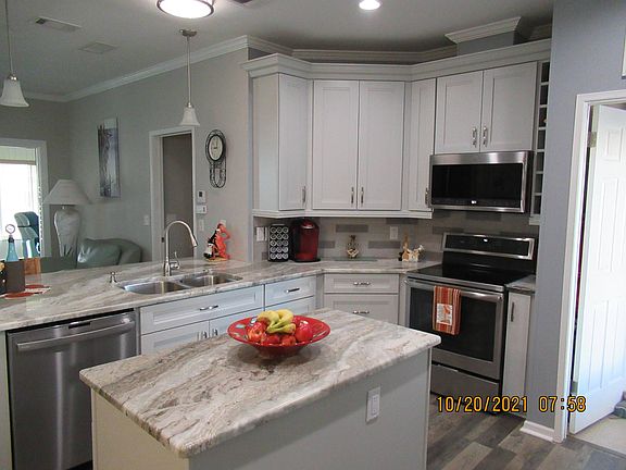 Beautiful, 2014, Jacobsen-built home with 1628 sqft of air conditioned-living space including the 2019 Florida room. Granite counters in kitchen and bathrooms. New cabinets and GE Profile kitchen appliances in 2020. Attractive gray wood laminate flooring new in 2018. Tall toilets new in 2020. Two bedrooms plus a den and the huge year-round Florida room (12' x 22'). There is also a big screened lanai 8' x 28'6" in the front of the home. Home comes unfurnished. Nicely landscaped corner lot. This home is on LEASED LAND with a monthly lot rent of $738.00 in the PREMIER Southport Springs Golf and Country Club community (55+ and pet-friendly). KITCHEN Gorgeous, renovated, open kitchen with center island and breakfast counter. Granite countertops and tile backsplash. All new cabinets in 2020. The all-stainless steel GE Profile appliances (smooth-top stove, French door refrigerator, built-in microwave and dishwasher) were new in 2020. The center island provides more counter and cabinet space. The ceiling has recessed lighting and the floor is wood laminate. DINING AREA (8'6" x 13') This area opens to the front foyer, living room and kitchen. Wood laminate flooring and a decorative light over the table area. LIVING ROOM (13' x 14') Good sized room for your couch and chairs. Laminate flooring and an attractive light ceiling fan. Entrance to the Florida room is here. MAIN BEDROOM (12'6" x 14') Good-sized room with the same gray wood laminate flooring and a lighted ceiling fan. There is a walk-in closet and a wall closet. MAIN BATH This is a large bathroom with a wide, double-sink vanity with granite countertop and subway tile backsplash. There are cabinets and drawers below and three more cabinets for your linens. There is a corner, walk-in shower. The floor is ceramic tile. BEDROOM #2 (10' x 11') This room has a wall closet, laminate flooring and a lighted ceiling fan. OFFICE/DEN (12' x 12'6") Laminate flooring and a lighted ceiling fan. Could be used as a 3rd bedroom. GUEST BATH Classy granite topped single-sink vanity, ceramic tile flooring and a tub/shower unit, plus wall mounted cabinet over the tall toilet. LAUNDRY Located off the kitchen is the Amana washer and dryer set that remains. There are four above. The floor is ceramic tile. Door leads to the carport. FLORIDA ROOM (12' x 22') Built in 2019 this huge room has horizontal-sliding, double-pane glass tinted windows on three sides. The Mitsubishi split HVAC makes this a year-round room. Vertical blinds and new (2021) shade awnings stay. There is an exit to the yard. The floor is the same gray wood laminate. FRONT LANAI (8' x 28'6") Wonderful, screened space to watch the world go by. Lighted ceiling fan and textured concrete floor. EXTERIOR The home has vinyl siding. The double-wide carport (22' x 25') easily holds two cars, the driveway handles four. The golf cart driveway leads to the 10' x 14' shed. Plenty of shelving, cabinets and a workbench. The water filtration system is located in the shed. The shingle roof and the Intertherm air conditioner were new in 2014. Home is on a corner lot, there is a lawn irrigation system and the yard and landscaping are beautiful. Southport Springs Golf and Country Club is the premier 55+ manufactured home community in Zephyrhills. It is beautifully landscaped and maintained. The clubhouse is large and modern. There is a restaurant and bar, a large heated swimming pool with two spas, fitness center, game room, tennis courts and a challenging 18-hole golf course. The residents are very active and pets are welcome. The lot rent for this home is $738.00 per month. There is an additional pass-on tax of $62.06 per month and a monthly trash pick-up fee of $12.18. Zephyrhills water is billed through the park. Shopping, restaurants, a hospital and medical offices are all close by. All listing information is deemed reliable but not guaranteed and should be independently verified through