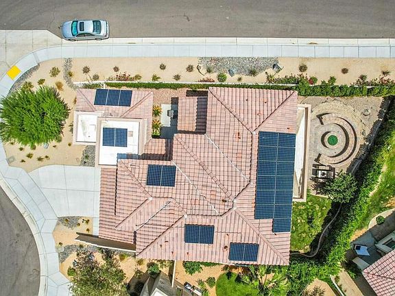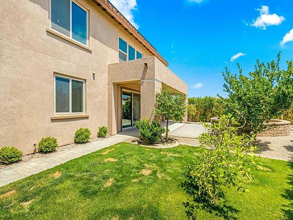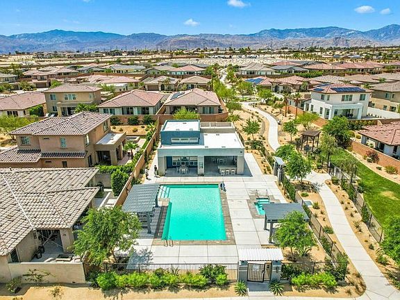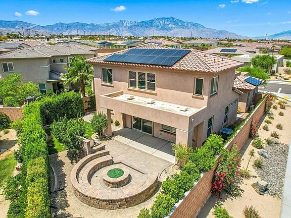 Welcome to your new home in Palm Desert! This stunning residence is located in the desirable, gated Genesis community, built in 2017. Offering 4 spacious bedrooms, including a detached casita with an en suite bathroom, plus an additional enclosed space perfect for an office, game room, or extra guest bedroom. The home features owned solar panels to help reduce electricity costs. The attached 2-car garage comes with a Tesla charger and extra storage space.Step outside to your expansive backyard, complete with fruit trees, a grassy area, a built-in gas fire pit with ample seating, and an outdoor gas wok range--perfect for entertaining. The low-maintenance desert landscaping in the front adds to the home's appeal.Conveniently located near shopping, schools, and hospitals, this move-in ready home offers access to a variety of community amenities, including 2 park areas, a dog park, a large community pool and spa, and a private gym. Genesis is a private, gated community designed for comfort and convenience--come see it for yourself!