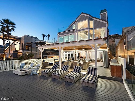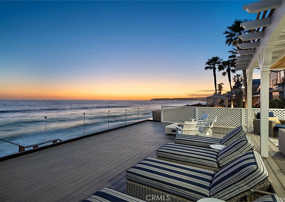This exceptional home offers a heightened beachfront living experience, situated in a 24-hour guard gated community with direct ownership of the beach up to the medium high tide line. Constructed on caissons, the sophisticated and stylish ambiance of the home is evident both inside and out, with new elegant lighting throughout, custom wrought iron railings, frameless glass balcony/deck railings, fresh interior & exterior paint, and exquisite marble walls in the family and primary rooms. The chef's remodeled kitchen is a culinary enthusiast's dream, equipped with high-end appliances including a Sub-Zero fridge, double ovens, marble and quartz counters, subway tile accents, and a stunning chandelier, all with views to the water, making it a perfect space for cooking and entertaining. The expansive great room is ideal for hosting gatherings, with its open layout and abundance of natural light through bi-fold doors that capture breathtaking views of the sand and white water coastal vistas beyond, creating a seamless connection between indoor and outdoor living spaces. The spectacular primary suite is a true retreat, featuring vaulted ceilings, loads of windows and light that enhance the captivating ocean views, an expansive balcony through bi-fold doors, and a marble fireplace wall, creating a serene oasis for relaxation. The primary bath boasts a large marble shower, flooring, and walls, along with a huge walk-in closet that is rarely seen on the beach. The oversized en-suite bedrooms with walk-in closets and private baths offer luxurious accommodations for family and guests, and the loft and bonus areas provide additional space for entertainment and relaxation. Outdoor living is taken to the next level with an expansive 37-foot deep Trex deck that includes a covered loggia with fans, an inviting fire pit & New BBQ Island, providing a serene atmosphere for enjoying the beachfront lifestyle and entertaining guests. This prime location also offers the opportunity to enjoy coastal Orange County living at its finest, with biking/walking trails, parks, 5-star resorts, great golf, shopping/restaurants, Dana Point Harbor, and excellent schools nearby.