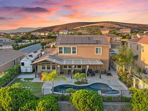 SPRAWLING VIEWS ~ RV PARKING ~ SPARKLING POOL AND SPA ~ PAID SOLAR ~ (INTERIOR PHOTOS COMING SOON) Welcome home to 35557 Laurel Tree Court, where tranquility and luxury meet! Discover this gorgeous 4-bedroom, 3-bathroom home situated in a peaceful cul-de-sac, offering breathtaking views from nearly every angle. With an office and a loft, alongside 4 spacious bedrooms, this well-maintained property is a true gem. The home exudes charming curb appeal with a cozy front porch and stone elevation, perfect for relaxing. Inside, the functional layout includes a downstairs bedroom and bath, ideal for guests. The gourmet kitchen features an extended buffet and a walk-in pantry for ample storage, not to mention picturesque windows showing casing the entertainers backyard. A wide stairwell leads to you to your cozy loft, additional living and the Primary Bedroom and spa-like en suite Bath. Did I mention the views? The outdoor space is a true oasis with a custom-built pool (July 2020) and a gable Aluma wood patio equipped with two ceiling fans. The beautiful landscaping includes multiple citrus trees, grapevines from South Coast Winery and a recently added concreate pad with a custom gate for RV Parking, measuring 45' deep. Modern amenities abound, including vinyl fencing, rain gutters, fire sprinklers, and a tankless water heater. Energy efficiency is ensured with a PAID OFF Tesla Solar system. Located in the award-winning Temecula Unified School District, this home is just minutes from shopping, wine country, and within walking distance to a park. Additional perks include RV parking, outdoor speakers, LVP flooring throughout the lower level and stairs, a dual-zoned AC unit, and breathtaking sunsets with views of hot air balloons. This home offers luxurious living and stunning views, making it a rare find you won't want to miss!