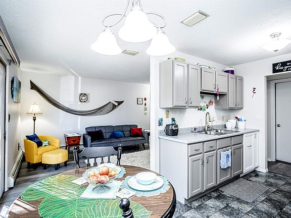 This fantastic condo offers 2 large bedrooms & an updated bathroom with walk-in shower. It has new LVP floors. The kitchen has newer counter tops, sink, faucets, & the cabinets done by N Hance!. The entire unit has been painted including the ceilings & has beautiful light fixtures & ceiling fans. There is a huge entry coat closet. Amazing Space did custom shelving in the walk-in pantry & in both bedroom closets The spacious living room has a fun shiplap wall adding even more character. This condo is located on the 2nd. floor along with the laundry room. It has a sliding glass door, which lets in lots of natural light, with newer vertical blinds leading to the balcony. It offers a great view with the 2nd bedroom overlooking the pool area. Association dues cover snow removal, lawn care, exterior maintenance , garbage, water, heat, & basic cable. Detached garage with storage area.