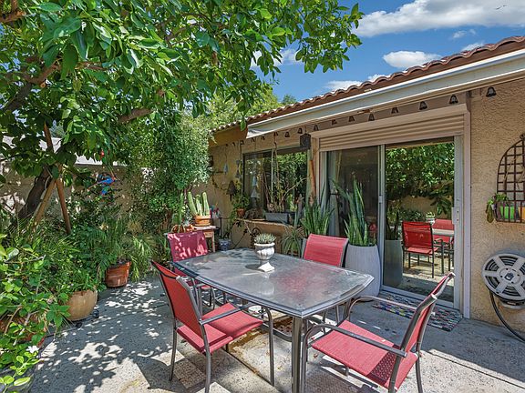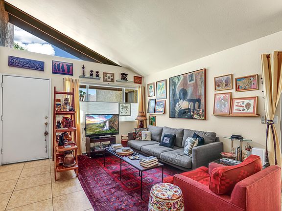 Located in the South Palm Springs gated neighborhood of Ridgeview, this 2 bedroom plus Den (or third bedroom) and 2 bath condo has strong architectural features including vaulted ceilings with a clerestory window. Tile floors throughout, custom window treatments including security shades, and good separation of bedrooms make this move-in-ready. The galley style kitchen has a gas oven-range, stack washer & dryer, pantry and tile counter-tops. The large primary bathroom offers a double vanity and walk-in shower with glass block accents. The private garden with mature landscaping immediately off of the living areas gives the condo outdoor spaces not found in most condos; enhancing the indoor-outdoor flow. The double, attached garage with built-in storage is a big plus. Ridgeview is ideally located in the South end and is low-density (only 44 units)with open space, expansive green belts, two pools, pickle ball and tennis courts.