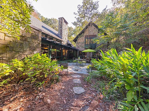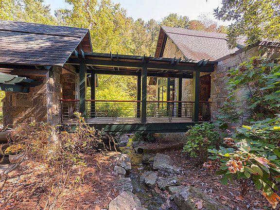 This unique 3 pavilioned home is designed for entertaining at its best. Nestled on 6 acres of private woods in between 2 mtns with Fuller Creek running along side, this custom elegantly crafted home looks as though it grew out of the ground.Meticulously engineered.Built with Alabama Blue Stone.This home has special touches reminiscent of The Prairie Style of design by Frank Lloyd Wright.African Mahogany cabinets,trim,walls,trey ceilings,Asian Kempas hardwoods,Ipa creekside deck,floor to ceiling windows,heated floors and mahogany paneled Sub Zeros are a few of the endless high end touches through out this 7000+ sq ft amenities galore smart home.Countless tech features:custom soundproofed theater w/kitchen,whole home automated customizable lighting system,elevator, and keyless automated entry. Home was designed by a prominent architectural firm and has been featured in many magazines.Plumbed for large 4th BR conversion if desired