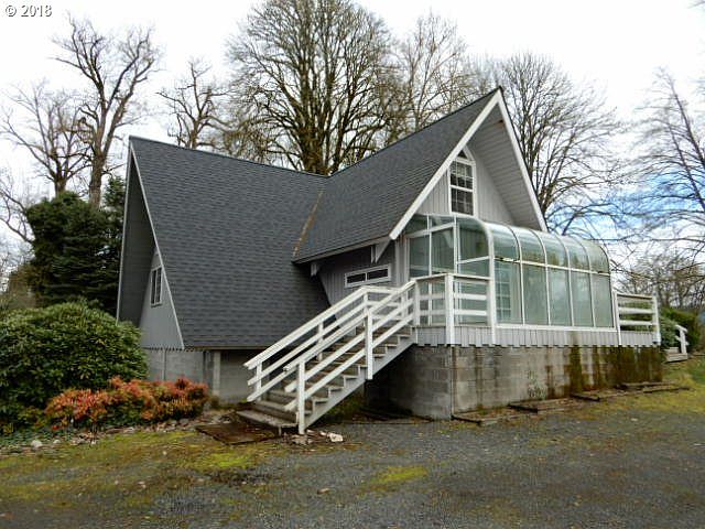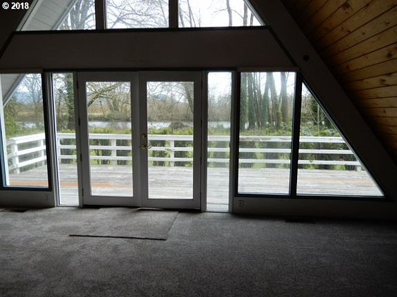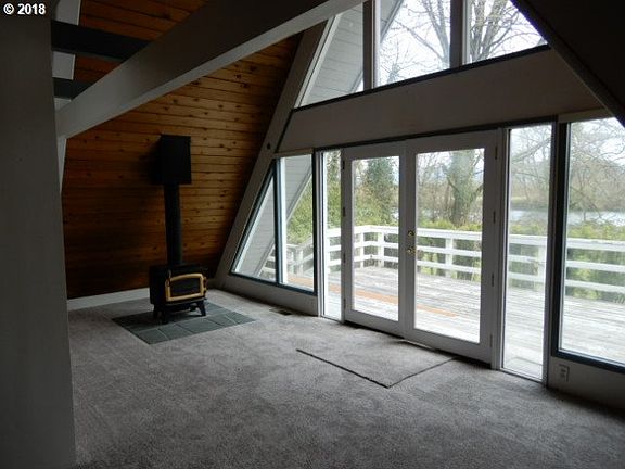 A-frame style home with McKenzie River frontage has a retreat feel with gorgeous river views and natural landscaping combined with open and expansive lawns. Tucked back off main road offers a private feel. Home features open beams, large kitchen with island. Exterior of home includes spacious decking with sunroom. A huge detached 2 car garage plus additional barn/shop. Property features 2 tax lots with 10 wooded acres.