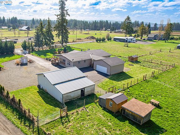 Welcome home to your charming 5 acre hobby farm, complete with a white picket fence and gated entrance! This quality-built 4 bedroom J and M Home features soaring 9-foot ceilings and easy-care laminate flooring throughout, creating an open and airy atmosphere. This home sits on approximately an acre of meticulously landscaped grounds, you can relax on your wrap-around deck and soak in the serene surroundings. The kitchen is a chef's dream, showcasing beautiful hickory cabinets, stainless steel appliances, and stunning corian countertops with a convenient eating bar. Retreat to the master suite, which boasts a luxurious soaking tub, double vanity, and an oversized walk-in closet for all your storage needs. The utility room features an additional pantry and provides access to a covered walkway leading to the spacious 2-car garage. The 24 x 32 pole barn offers ample space for storing your toys or pursuing hobbies. The back of the property includes lean-to buildings, perfect for your animals to find shelter. With level acreage, your furry friends will love grazing in the lush green fields or lounging in the shade of the trees. This property truly has it all!