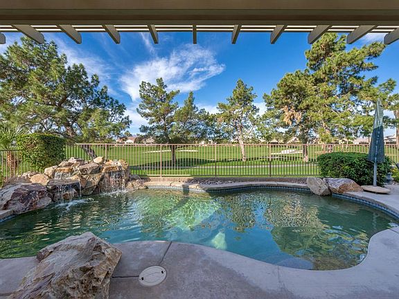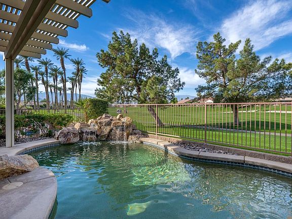 Sun City Palm Desert - Morocco w/Casita. This incredibly popular greatroom + casita home sits over the 7th fairway . The beautiful rear yard features a pebbletec pool with cascading waterfall, a spacious patio, alumawood patio cover, lush desert landscaping including artificial turf and panoramic golf course and mountain views. A gated front courtyard features a practice putting green and along with an updated paint scheme provides curb appeal. Inside, the main home has 2 bedrooms, 2 bathrooms and a den/office. The detached casita provides an additional bedroom and bathroom. 10ft ceilings and transom windows provide a light and open environment. Tile flooring is in all but the guest bedrooms. The greatroom features a custom built-in media center. The den/office has a custom built-in desk and cabinetry. The kitchen features corian counter, a chef's island, upgraded appliances and cabinets with pullout shelves. Raised panel maple cabinetry is in the kitchen, bathrooms, and laundry. Double doors open to the primary suite that has a bay window with shutters and a large walk-in closet with built-ins. The primary suite bath has dual sinks, a large stall shower with glass enclosure and upgraded lighting. A tub/shower is in the guest bathroom. Shutters are also in the guest bedroom. The extended 2 car garage has a nook for golf cart parking, an epoxy floor and built-in storage.