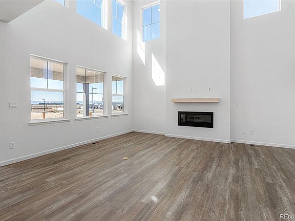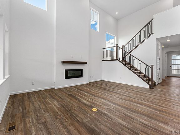 Ready Now! Explore the captivating Ridgway residence located at the end of a peaceful cul-de-sac with scenic mountain views in The Aurora Highlands. This home boasts soaring 2-story ceilings in the great room with beautiful mountain views from the covered rear patio. The kitchen features built-in stainless steel gas appliances, a large center island with plenty of room for barstools, oversized walk-in pantry and mudroom with plenty of storage space. Upstairs you'll find 3 oversized bedrooms including the primary suite with 5-piece bathroom, dual sinks and walk-in closet. There's also a massive loft, second floor laundry room, several storage closets and a main floor study, perfect for remote work. The full unfinished basement allows for future expansion, gym, storage or play space. Design upgrades include rye maple cabinets, granite countertops in the kitchen, crown molding on the kitchen cabinets, and LVP floors throughout the main level. Structural options include: covered rear patio with mountain views, full unfinished basement with rough-in plumbing, 2 air conditioning units, gas stainless steel appliances, 5-piece primary bath, modern fireplace with wood mantel, double 8' doors at study, 8' interior doors on main level, door to primary bath, and open railing to the second floor.
