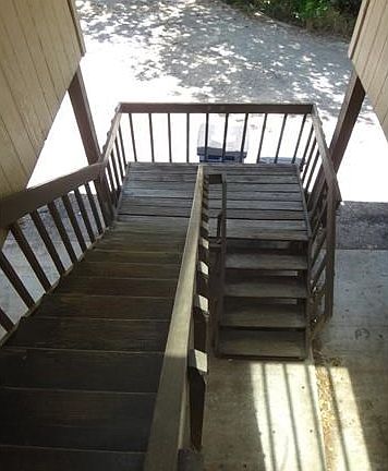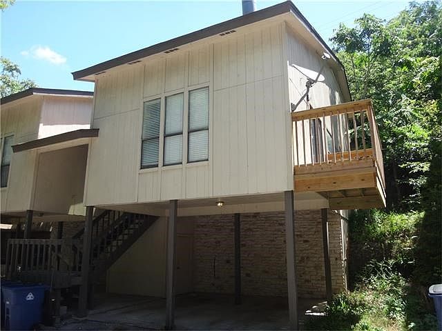 Living & dining areas w/ high ceiling, wood burning fireplace, balcony & tile flooring. Kitchen includes refrigerator, electric range, dishwasher, disposal, microwave, pantry, closet w/ washer & dryer connections and back door to private back deck. One bedroom & full bathroom downstairs. Master bedroom w/ private full bathroom and walk in closet upstairs. 2 reserved covered parking spaces w/ storage closet. Driveway off 2222 w/ wooded views. Easy access to Mopac! No cats. Dog(s) with approval.