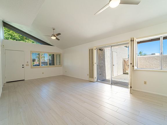 Beautiful, single-level 3 bedroom, 2 bath condo in South Palm Springs. Updated wood-looking tile floors throughout, recently painted with updated kitchen and bathrooms. Vaulted ceilings in the main living area and master bedroom provide a spacious and open feeling. Tons of natural light flood the interior. Special features include designer ceiling fans and plantation shutters throughout. The master suite boasts a large walk-in closet and updated bath with walk-in shower. On the opposite side of the condo are the two guest bedrooms and additional bath (currently used as an office, the third bedroom can easily be turned back into a bedroom - folding doors in garage). A large, private outdoor patio offers mountain views and easy access to the community pools, spas, and tennis courts. Additional features include indoor laundry and a 2-car private garage. Perfect, quiet location within the resort-style gated community, just steps away from one of the pools and tennis courts. Near Smoke Tree shopping Plaza with restaurants and shops. Land lease is currently in negotiations to become fee simple land. Low HOA includes earthquake insurance and trash.