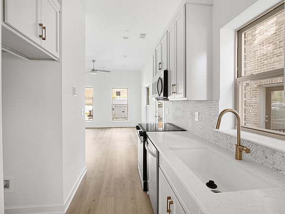 Suburban chic new construction 1 bdrm/1 Bath condo flat! Open floor plan featuring 10ft ceilings, Mohawk Revwood laminate flooring throughout, galley kitchen features quartz countertops, pantry, tile backsplash, custom built cabinets with soft close doors and drawers & SS appliances! Covered patio/dedicated parking. Urban feel with walkability to restaurants and shopping.