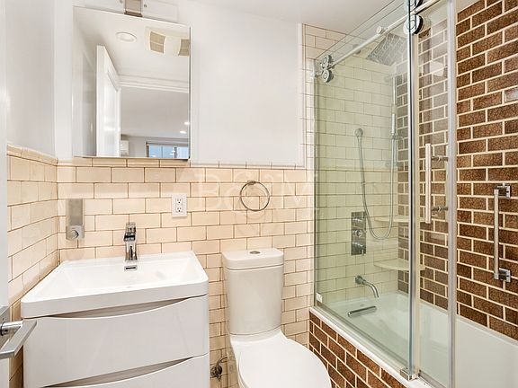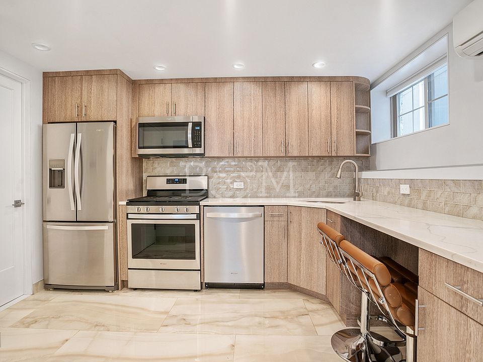 This home's kitchen is a dream to cook in! It features beautiful marble countertops, a dishwasher, a microwave, and a French door refrigerator with an extra-large freezer drawer! This stylish renovation is like no other, offering exceptional quality rarely found in a rental. Enjoy the gorgeous faux marble floors, custom cabinetry, abundant storage including a 4 x 5 feet storage room, recessed lighting throughout, and a split-duct climate control system. The bathroom features a deep soaking tub, and both a handheld and a rain shower. This studio is located on the garden level of a townhouse and has its own entrance. The townhouse sits on a quiet street in Bay Ridge with restaurants, grocery stores, and shops nearby. The R train is 2 blocks away. Heat & Water are included. 1,5-year lease is being offered. Pets are allowed on a case-by-case basis. No calls or texts, please.