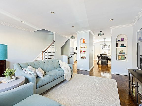 The light-filled second floor features northern and southern exposures, a spacious living room, and a renovated kitchen with stainless steel appliances, stone countertops, an island, and custom cabinets. The windowed kitchen is open to the dining area and a French door at the rear of the home floods the space with natural light and offers an additional entryway to the oversized backyard.
