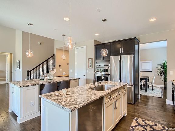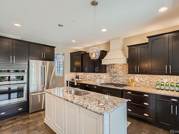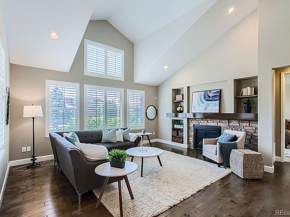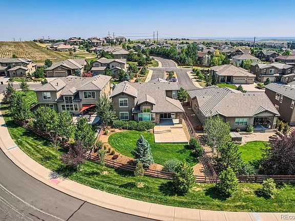 Move-in ready NOW, why risk new construction delays or defects? $25,000 buyer incentive for rate buy-down or stylistic changes to enhance main-level primary suite or add another laundry area. In this home, elegance and functionality blend seamlessly in the established Cliffside neighborhood, sitting on a peaceful lot at the edge of the neighborhood and across the street from a trailhead to a spectacular view point. Soaring ceilings and ample windows capture the openness throughout the main living area. The kitchen is sophisticated, featuring white and espresso shaker cabinets, two granite islands with ample space for meal prep and casual dining plus wine storage. Sleek built-ins and a stone surround gas fireplace with a solid wood mantle create a focal point in the living area. Formal dining for large gatherings. The main level is thoughtfully designed with a rare, large bedroom suite with plentiful storage and ¾ bathroom, ideal for those wanting a main level primary bedroom or visitors seeking comfort and privacy. The main level home office with sleek built-in white shaker cabinetry for an organized workspace. Ascend to the upper level where another primary suite awaits—a luxurious sanctuary with a 5-piece bath and two walk-in closets. Two more upper bedrooms each feature private, en-suite full bathrooms. The loft provides a flex space for relaxation or play with study nook. Convenient, upper level laundry room has tons of storage. The finished basement is a haven for entertainment. A kitchenette with a wet bar, beverage fridge and extensive counterspace makes hosting easy. A media room for your cinematic experiences, family/game room, 3/4 bath, 5th bedroom, second utility space and HUGE storage room complete the basement. Step outside to a covered patio to enjoy your expansive, fully-fenced private yard. 3-car garage. Nestled in a great community with low fees for trash, pool and clubhouse. Convenient access to I-25 yet a peaceful distance for quiet enjoyment.