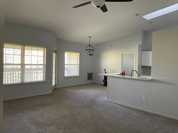 Open floor plan with bedrooms situated on each side of unit. Brand new carpet.Each bedroom has attached full bathroom for privacy. Great room with vaulted ceilings and a skylight. Attached one car garage, secured entry, across the street from poolhouse. Covered deck that backs up to the woods.