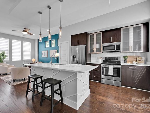Hidden gem in the heart of Southend. Walkability! Shops, restaurants, nightlife and light rail within minutes! Great floor plan offers oversized attached garage w/additional storage. Kitchen w/large quartz island & countertop, stainless appliances including refrigerator and pantry. Access to rear enclosed deck. Half bath on this level and open to great room w/ceiling fan. Upper level offers spacious primary suite w/walk in closet, laundry, additional closet, built in cabinetry & ceiling fan. Bath offers dual sinks, quartz countertop, oversized glass/tile shower and linen closet. Custom window treatments and beautiful wood flooring throughout. New HVAC 8/23. Agent is related to owner. Move in ready!