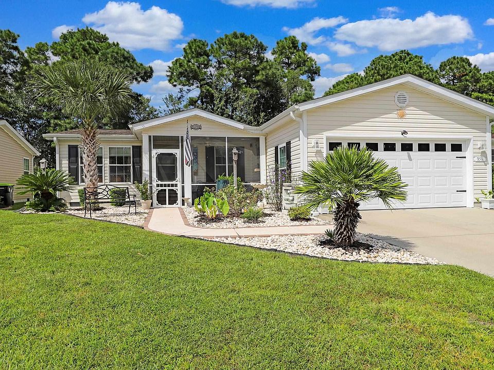 Welcome to this beautifully maintained 3-bedroom, 2-bathroom Troon model—the largest floor plan available in the highly sought-after Lakeside Crossing 55+ community. As you arrive, you'll be greeted by a charming screened-in front porch with finished concrete flooring, perfect for enjoying your morning coffee or relaxing in the evening. Step inside to a spacious kitchen featuring custom cabinetry, an abundance of counter space, a complete appliance package, and a solar tube that fills the room with natural light.  The open-concept living and dining areas are bright and inviting—ideal for both everyday living and entertaining guests. The primary suite offers a peaceful retreat with two walk-in closets and a luxurious ensuite bathroom that includes a double vanity, a separate makeup station, and a beautifully tiled walk-in shower.  A large flex space with a wet bar provides endless possibilities for use—game room, home office, or hobby space—and leads out to your private, fenced backyard. Additional highlights include laminate wood flooring throughout most of the living areas and a spacious 20x20 garage for extra storage and convenience.  This home truly has it all—comfort, style, and functionality in a vibrant community. Don’t miss your chance to make it yours—schedule your tour today before it’s gone!