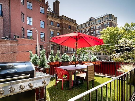 Back Bay outdoor space lovers: take notice! Expansive, lower duplex condo (1,698 SF) features 2 signature outdoor spaces plus direct access parking. Parlor living floor has charm and character with gas fireplace, decorative moldings and ceiling heights exceeding 10'. Kitchen area has amazing, built-in table with expansive counter tops and built ins. Decorative fireplace also adorns this area. A bridge connects the kitchen to a large deck which is sure to wow your friends and family when you entertain. On the lower level you'll find two bedrooms. Both are accompanied by top of the line, ensuite bathrooms. The beautiful, enclosed patio space is a sanctuary unto itself. A secondary living area with built in desk and gas fire place can also be found on this floor. 200 amp service plenty for powering Tesla or other electric car. This unit has it all - perfectly configured for entertaining with the bedrooms downstairs, two outdoor spaces and that all-important direct access parking.