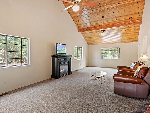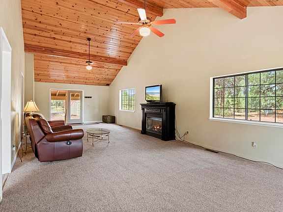 This freshly painted custom home with private WELL, 3 oversized bd, 2ba, 2048SqFt, 2 car GAR, bonus Room, dog run, Workshop shed w/elec. MBR-walk-in closet, attic storage with easy access & new carpet. Great room, Vaulted Ceilings, dual pane windows, gas fireplace, new carpet. Huge gourmet, eat-in kitchen has double ovens, built-in microwave, warming drawer, 5 burner gas cooktop, dishwasher, disposal, GE stainless steel refrigerator, pantry, island with sink, custom KraftMaid cherry wood cabinets, gorgeous siltstone counters, central A/C, Furnace-air purifier system. swing set, basketball court. School is pre-K-8th 0.5 mile away, Flagstaff is 15 min. Bring your toys to enjoy the freedom that the forest has to offer. Elk/deer visit regularly. Don't miss out on this captivating property.
