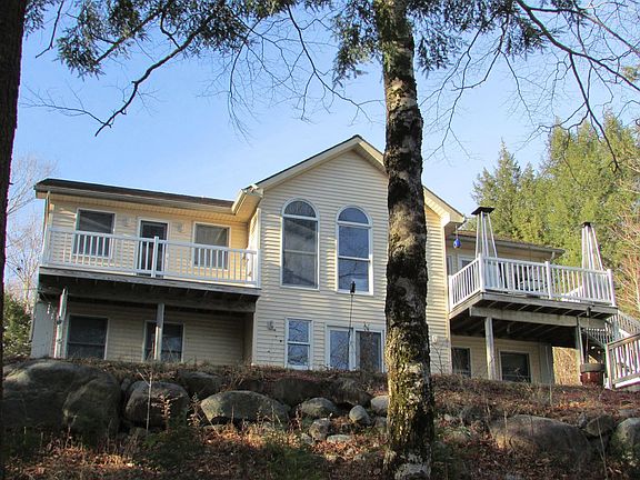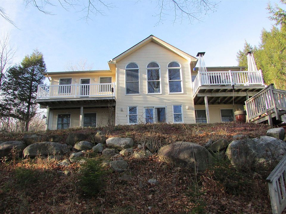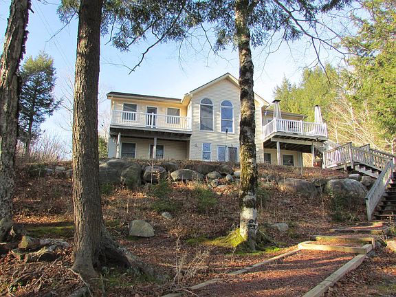 3 Bedroom, 2.5 Bath Ranch built in '02 with FULL FINISHED Walk Out Basement to total over 2700 Sq ft! PRIVATE 1.24 Acre Lot with over 200' of DIRECT ACCESS to a quiet cove overlooking the larger Peck Lake. Lot is level to house then sloped beyond, down to the water's edge. Offers INCREDIBLE views from the whole house! Water is 6'-7' deep off the INCLUDED dock. Offers great swimming and easy tie up for your boat. Master Bedroom and Bath, complete with expansive walk in closet with built in storage and PRIVATE BALCONY are on the main level! Kitchen with island opens up to the Great Room and Dining Area with Gas Fireplace, Hardwood Floors! Full Bath, 2 Beds, Large Family area and Office Space with Radiant Heat make up the lower level. 3 Decks and Patio area for outdoor entertainment.