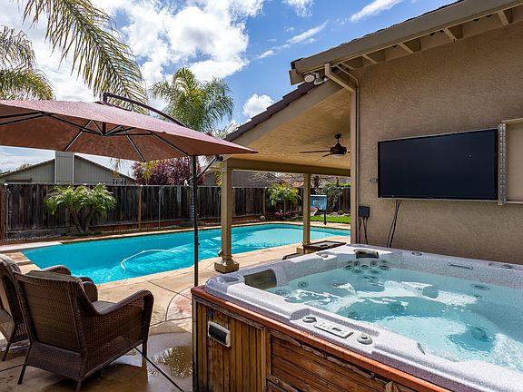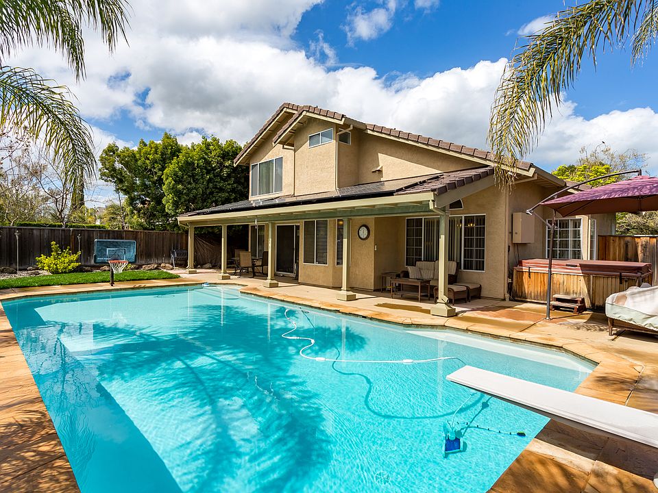 Beautiful Two Story home with backyard Oasis, this home features almost 2000 sq. ft., 1 bed/1 bath down, updated kitchen, formal living and dining room, in ground pool, hot tub and owned solar system, right across the street from a small community park.