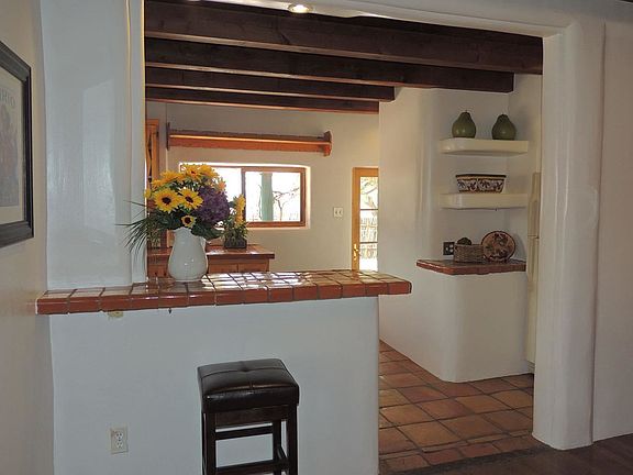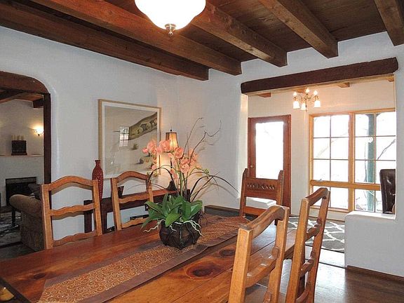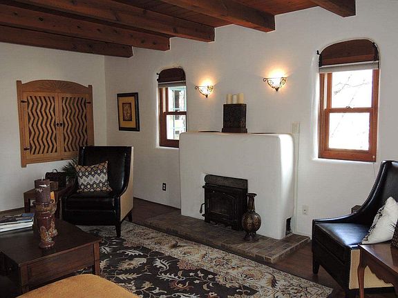 This is an utterly charming adobe home on a large lot with a kiva fireplace in the beautiful front courtyard. It's a great in town location close to schools and shopping. It truly is a private and serene sanctuary in the middle of Santa Fe. Mature trees, Sangre views, and a wonderful light, and bright studio space with an additional workroom off the studio. Very versatile floor plan allows for many possibilities of the space, and it just oozes Santa Fe charm. There is an additional adobe shed, and pump house for the private well. There is also a basement and a fireproof "safe" room. Large trees, grape vines, winter hoop garden bed, and drip irrigation. Come and see this one!