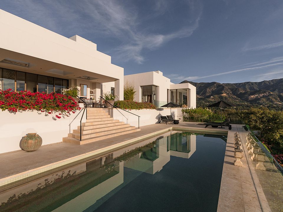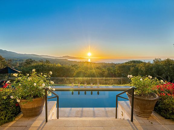 This sanctuary offers panoramic vistas of the Pacific Ocean, the coastline, and the Santa Ynez Mountains. Laid out on a single level, the home offers approximately 7,500sf of thoughtfully designed living space, featuring 5 bedrooms and 5.5 baths. Designed by the acclaimed Warner Group Architects, the home is a timeless expression of modern architecture seamlessly integrated into its natural surroundings. Outside, the estate becomes a private sanctuary. The grounds are lush and layered with thoughtful touches: an orchard of over 40 fruit trees, a peaceful lemon arbor with a hand-cut stone bench, a fire pit, and a bocce court. For entertaining, the game room brings a playful spirit with shuffleboard, air hockey, and darts. The pool and spa, tucked among mature oaks, bougainvillea, jasmine, and ferns, offer a relaxed, resort-like atmosphere with the privacy of a hidden retreat. Additional features include a 3-car garage and a spacious, east-facing loggia with an outdoor fireplaceperfect for sunrise coffees or winding down as the day fades.