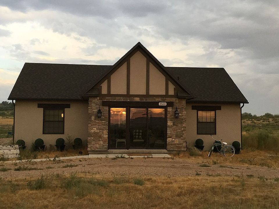 This home was designed by a lover of horses, in the English stable look, it is there to impress your equestrian senses. It features Barn Door entry, and sliding glass doors, enter onto brick pavers in the herringbone style. Wood beams accent the ceiling, as well as all the windows. A full size Horse Stall partition separates the entry from the living room. Nine foot ceilings in all rooms except the living and dining area where a vaulted ceiling awaits you. A storage unit with built in Gel fireplace, as well as built in ceiling speakers in the Living, master bedroom, and enclosed front porch areas. Also in the front porch area are inferred ceiling heaters for those cold winter evenings, sitting in your enclosed front porch enjoying an evening sunset over the mountains. Refrigerator, as well as dishwasher, microwave oven, stove, oversized water heater are all included. The back yard features a wood post fenced in area approximately 75+180’ for your horse riding pleasure. If this sounds appealing to you, call for a showing, this could be your new home!