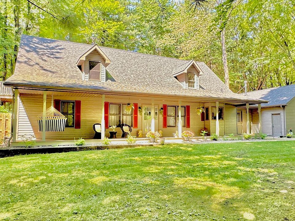 Discover tranquility, privacy, and wooded bliss on this nearly 3-ACRES updated estate, featuring a custom POND and a 32x32 POLE BARN w/2 horse stalls. 3 spacious bedrooms, 3 bathrooms built in 1994. Vaulted ceilings, over 2200 sq ft, grand floor-to-ceiling stone fireplace, open floor plan. BEAUTIFUL kitchen w/abundance of white cabinets, large island w/seating and dining. 1st floor MASTER SUITE retreat w/luxurious bath, jacuzzi tub, separate shower & bidet. Huge 2nd floor bedroom-family room combo. The balcony adds flexibility for a home office & reading nook. 1st-floor laundry room, Indulge in your own private tiled spa w/hot tub ideal for relaxation & rejuvenation. Easily entertain inside or out w/the sliding patio wall leading to a tiered deck & expansive cement patio. Enjoy the 2.5 car attached and HEATED garage. Must see property detail sheet for all the extras. Cameras in use on property. BOOK your showing NOW before it is gone!