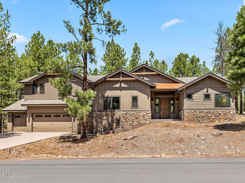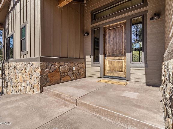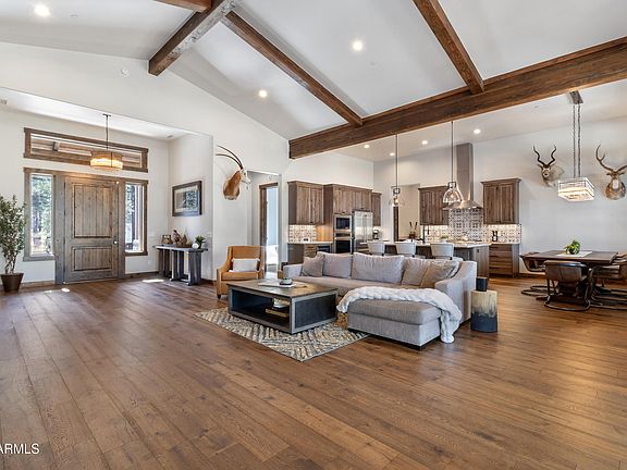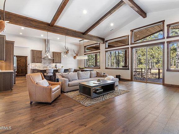 Nestled amidst the towering pines of Flagstaff Ranch, this extraordinary custom home offers a rare blend of luxury, privacy & breathtaking golf course views. Designed & built by the highly sought-after Everest Construction, this masterfully crafted retreat sits on a premier lot along the 6th fairway of the Flagstaff Ranch Golf Club, seamlessly integrating the beauty of the natural landscape with impeccable modern design. From the moment you step through the grand entryway, you are welcomed into an inviting, light-filled space where exposed wood beams, vaulted ceilings & walls of windows showcase the serene, tree-lined setting. The great room serves as the heart of the home, anchored by a stunning gas fireplace with a custom stone surround, creating the perfect atmosphere for both grand... entertaining and intimate evenings by the fire.
