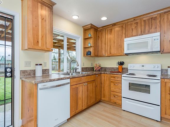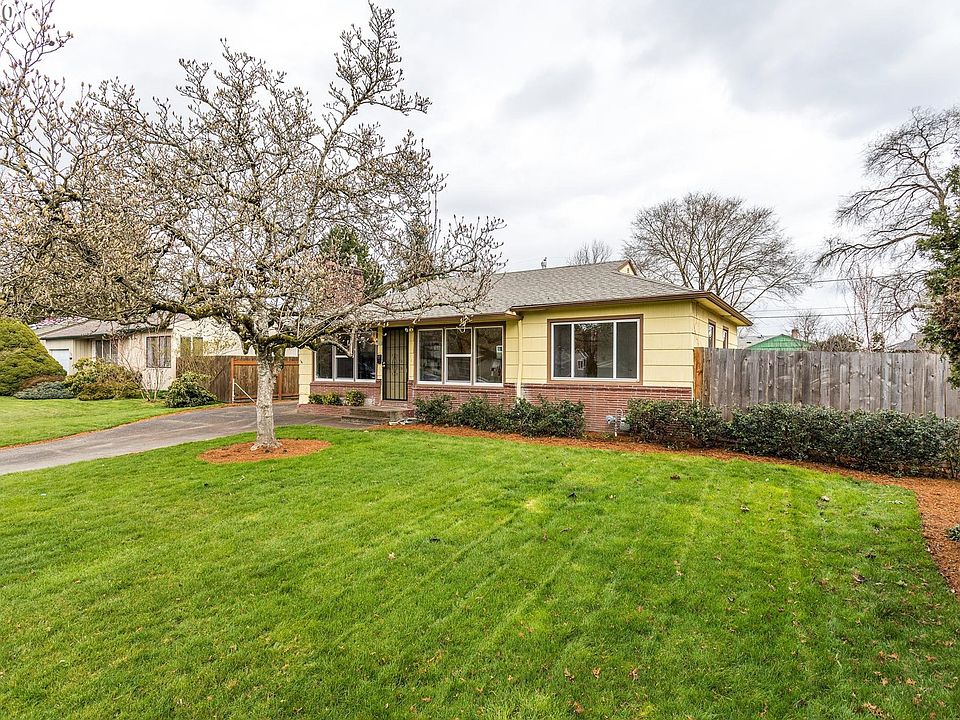 One level 1950s bungalow with updated kitchen and bath. Dual pane windows, newer roof, large yard and detached single car garage