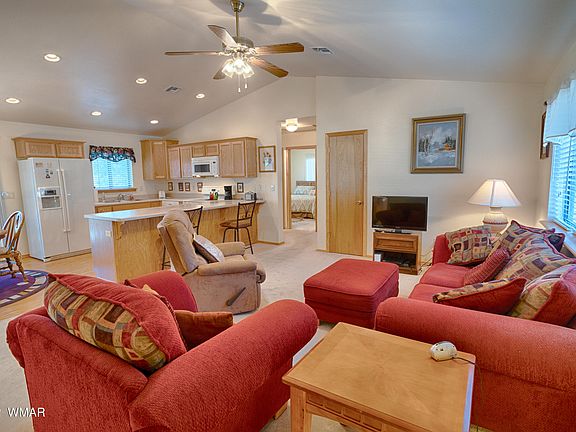 Single level home is on the 17th fairway of the Bison Golf Course! Move in ready. Three bedrooms and two bathrooms in this split floor plan. Vaulted ceilings in the great room. Large kitchen bar where you can sit and eat, or hang out with the cook. 1404 sf with a one car garage in the middle of Show Low, AZ close to everything. Great neighborhood. No HOA. Sold furnished.