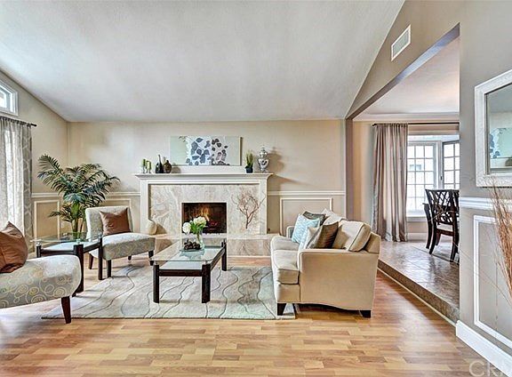 Casual yet elegant defines this distinctive home! From the moment you arrive youll be captivated by the extensive use of attractive natural stone hardscape & lush landscape. The interior features decorator paint in neutral earth tones and will compliment most any dcor. The living room features a stunning picture window, smooth cathedral ceiling, plus a beautiful travertine fireplace & hearth. This home is highlighted by an array of natural light embracing this desirable and open floor plan. The great rooma combination family room & kitchen is a spacious area and perfect for your casual daily living in addition to a separate formal dining area w/custom French bay windowYoull be charmed by this beautifully appointed kitchen w/granite countertops & custom backsplash plus stainless steel appliances (incl double ovens) recessed lighting and an eating area. Addt'l amenities incl. central air, attractively remodeled baths (custom w/2 sinks in each bath), inside laundry, custom interior doors, new base & crown molding, copper plumbing, mirrored wardrobes, and the 4th bedroom has been converted to an office/guest room (w/direct garage access & fire-rated door), and much, much more!!! Highly acclaimed Los Alamitos School District...This is an amazing home!