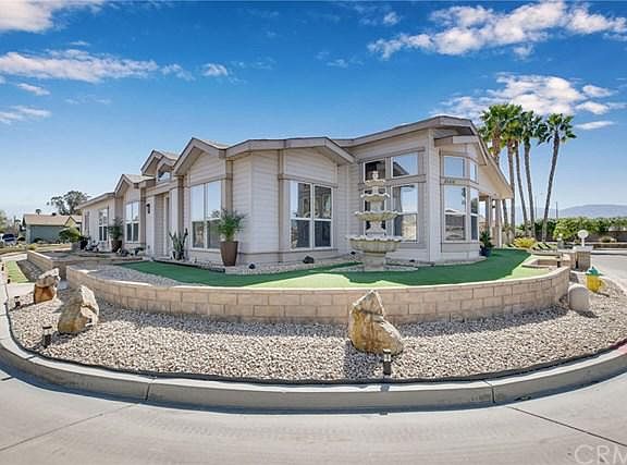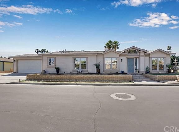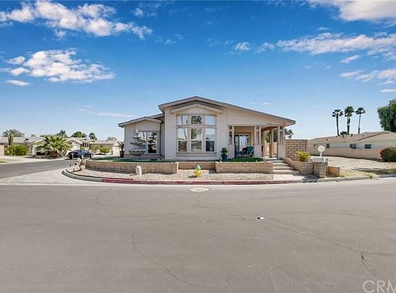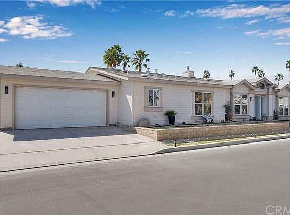 Beautiful 2 bedroom and 2 bathrooms 2,496 Square feet 2004 built Manufactured home on 5,663 lot, located in Thousand Palms 55+ age community in Ivey Ranch which includes pools, tennis courts and golf course . The entrance to the home is a landscape oasis with a low maintenance beautiful front yard. Once inside you will immediately notice the large open living room with a gorgeous fireplace and charming mantel that leads to the beautiful updated kitchen with a large island ,built in oven and space saver microwave and complete with lots of cabinets for storage. This home has lots of windows to let natural light in. The master bedroom features a retreat area with a slider that leads to the back yard along with two ceiling fans. The large walk in closet has lots of storage, dual sinks in the master bath and a private attached shower. The other two bedrooms are very spacious. This beautiful home has 2 car attached garage with newer garage door opener, two AC units along with a spacious indoor laundry room. The fenced backyard has BBQ area that will keep you entertaining this summer with friends and family.