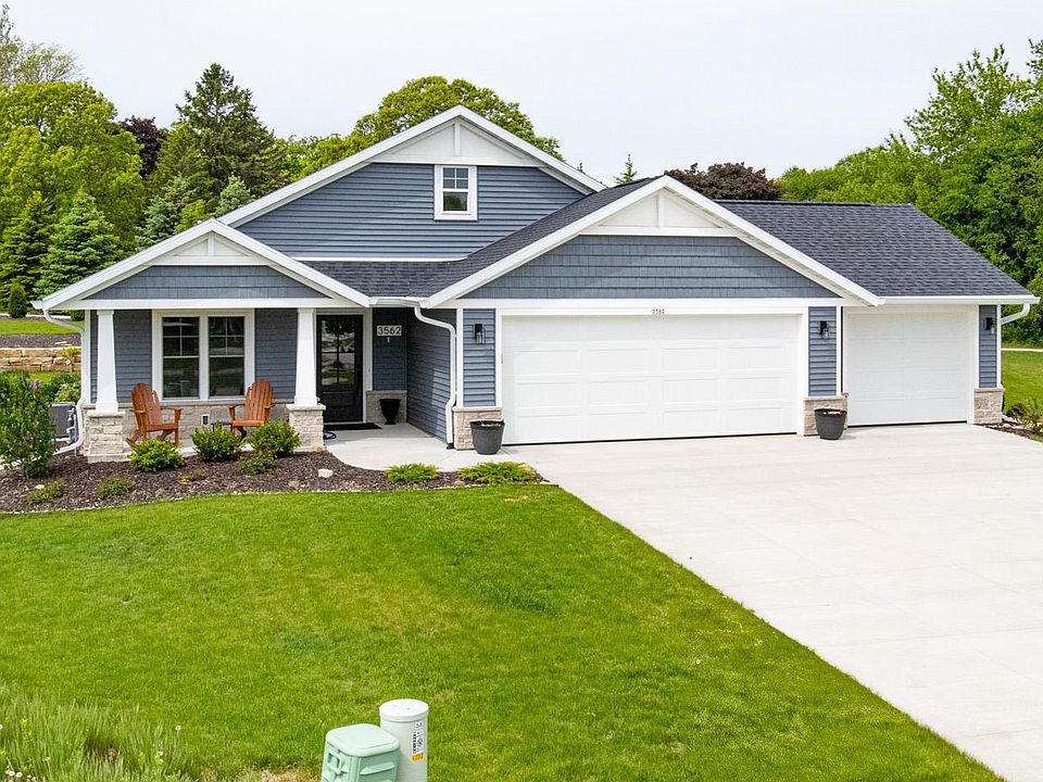 Custom built by Wesenberg Homes in 2023, this home is better than new! Located in the Lake Vista neighborhood, this desirable open concept ranch has so many features inside and out. Inviting curb appeal w/ front sitting porch, great room w/ elevated ceiling + fireplace, kitchen w/ island + walk-in pantry, generous dining area, screen porch to enjoy the sun, primary suite w/ walk-in closet + bath w/ tile shower and finished lower-level has family room + guest suite. Beautifully appointed w/ so many upgrades including gorgeous hardwood floors, solid surface counters in kitchen + all baths and a heated 3 car garage w/ epoxy floor. All this plus home has established landscape, a backyard patio and is adjacent to neighborhood walking trail that connects to Jones Park!