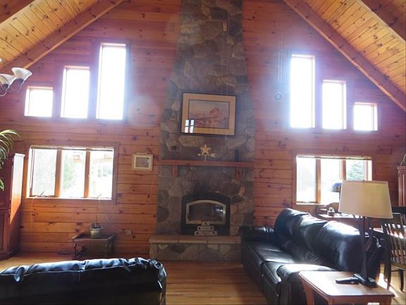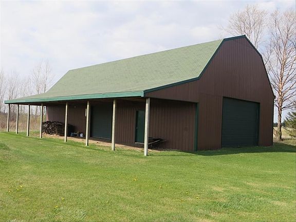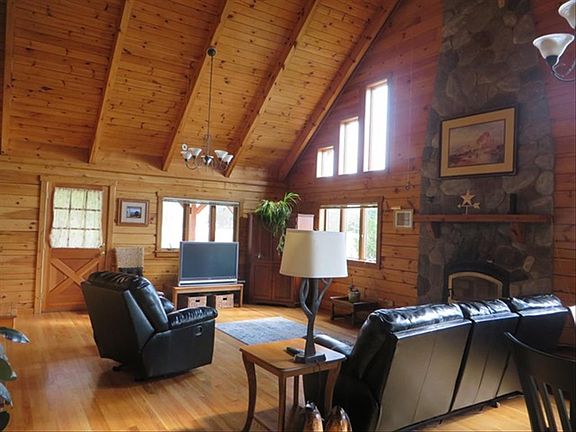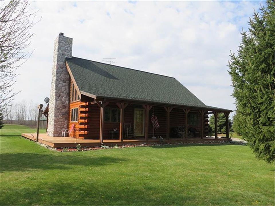 Don't let the 1 bedroom fool you. Loft area very easily converted to 2nd bedroom. Or utilize garage for more sq. footage . Four acres with a scenic pond and a 32 x 60 pole barn. The log cabin features wood flooring throughout. The kitchen has a brand new dishwasher & quartz counters. A floor-to-ceiling stone fireplace and newer carpeting. The pole barn has endless possibilities because it has 2 large overhead doors and an expansive 2nd floor. The roof is brand new! The home was built with logs halfway up the home and then cedar siding to the roof. Tri-County Electric service.