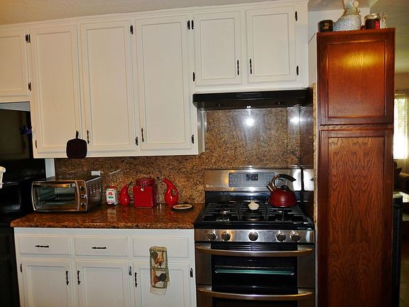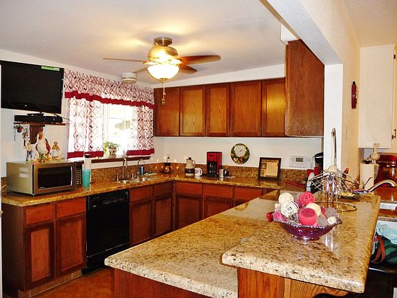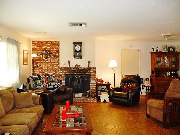 As you drive in, you will see the beautiful trees & landscaping. The large paved driveway also has a huge carport that leads to the 2-car garage. The property is fully fenced in the back with wrought iron gates. As you enter you will notice the brick fireplace, the 18" tile floors & the scraped ceiling. This great room concept has a large living/dining area & a remodeled kitchen...with two work areas. The kitchen has granite counters, stainless steel two-oven, gas range, a dishwasher, a huge pantry room.....and an inside laundry. Off the dining room is a huge yard with covered patio & a 20'x20' unpermitted workshop. There are three bedrooms and 1.75 baths. All the ceilings are scraped except two of the bedrooms. There is natural gas & a shared well...Hometown Water Coop with 12 members. And last but not lease....there is a paved road on one side of the property.