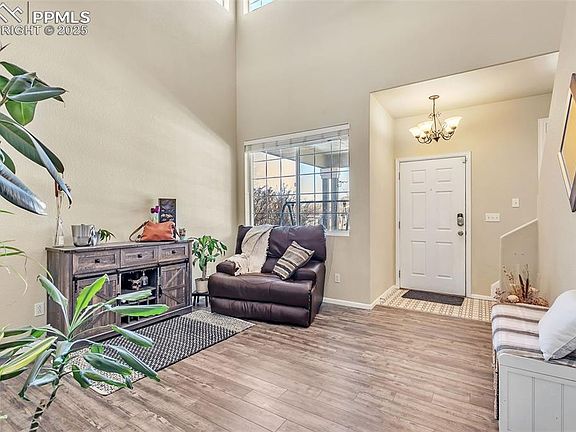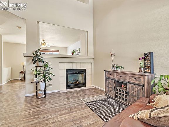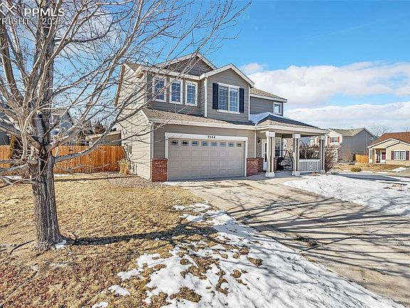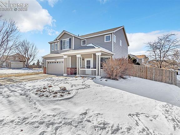 Nestled on a spacious 1/4-acre cul-de-sac lot, this beautiful home is a rare find! The inviting covered front porch welcomes you into a thoughtfully designed space with soaring ceilings and abundant natural light. The open floor plan effortlessly combines functionality and style, making it perfect for both everyday living and entertaining. The main level boasts updated tile and brand-new flooring, creating a fresh and modern ambiance. Enjoy cozy evenings by the two-sided gas fireplace, perfectly positioned to warm both the living room and great room. The large eat-in kitchen features stainless steel appliances, ample counter space, a pantry, and a walkout to a large patio and spacious backyard. Here, you'll find stunning mountain views including Pikes Peak, a storage shed, and plenty of space to relax or entertain. The active solar system enhances energy efficiency, saving you money while reducing your carbon footprint. Upstairs, a massive loft overlooks the living room, offering a versatile space for a home office, playroom, or additional lounge area. The primary suite is a peaceful retreat, complete with a private ensuite bathroom. Ceiling fans and central air keep the home comfortable year-round. The oversized garage includes a built-in workbench, ideal for DIY projects, hobbies, or additional storage. Conveniently located near Peterson Space Force Base and the Powers Corridor, this home is close to shopping, dining, and top-notch schools. Don’t miss your chance to own this meticulously maintained property with upgrades that truly set it apart. Schedule your private showing today and prepare to be impressed!