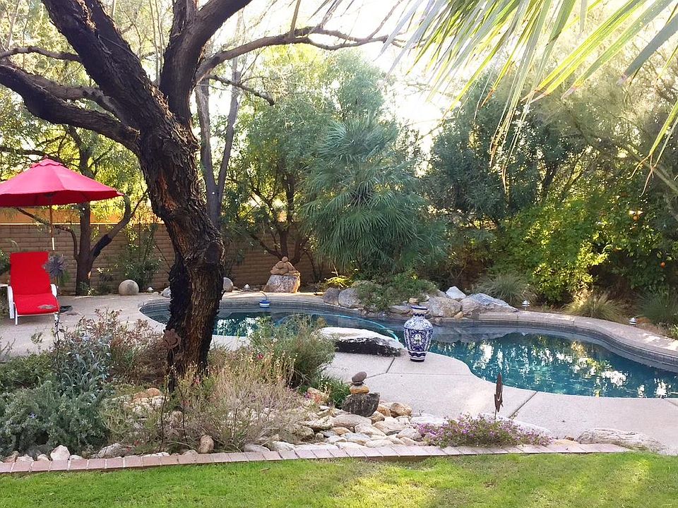 Catalina Foothills, 5 minutes from La Encantada! Gorgeous home inside and out . Swimming pool with beautiful landscaping and a privacy wall. Views of finger rock mountain , quiet cul de sac , attatched garage , large closets, w/d, spacious kitchen with view of pool, sliding glass door to patio, dishwasher and mud room to garage . Cooling cement floors & Saltillo tile , large oval windows and doorways , French doors in master bedroom with full bath/ shower , tub in second bathroom, skylights in bathroom & kitchen. Serene atmosphere and neighborhood. Pictures do not do it justice . This is a must see! No smoking. Some pets allowed. Pay for garbage and electric. One year lease
