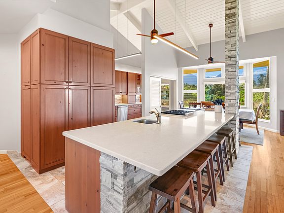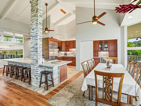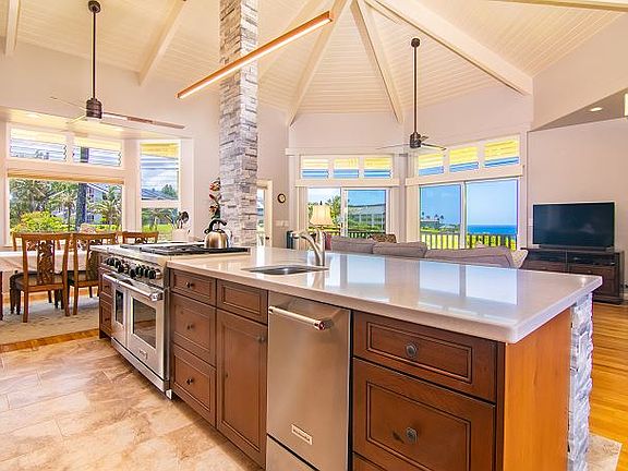 The modern kitchen features ocean views, cherry wood cabinetry, stone quartz countertops, Sub-Zero refrigerator, Wolf range, and stainless-steel appliances, flowing seamlessly to multiple dining areas and the lanai. Vaulted open-beam ceilings, abundant windows, and an open floor plan create a bright, inviting atmosphere ideal for entertaining. Enjoy whitewater views, whale watching, waterfall vistas over Namolokama, and unforgettable sunsets.