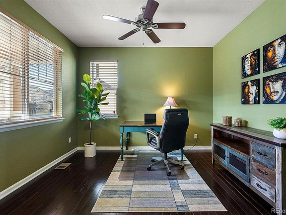 Upon entry, you’ll be greeted by a dedicated office space and gorgeous wood flooring that flows throughout the main level. The open floor plan is perfect for entertaining, featuring a cozy living room with a gas fireplace and ceiling fan, a spacious dining area, and a gourmet kitchen complete with quartz countertops, white cabinetry, a double oven, glass cooktop, and a walk-in pantry.