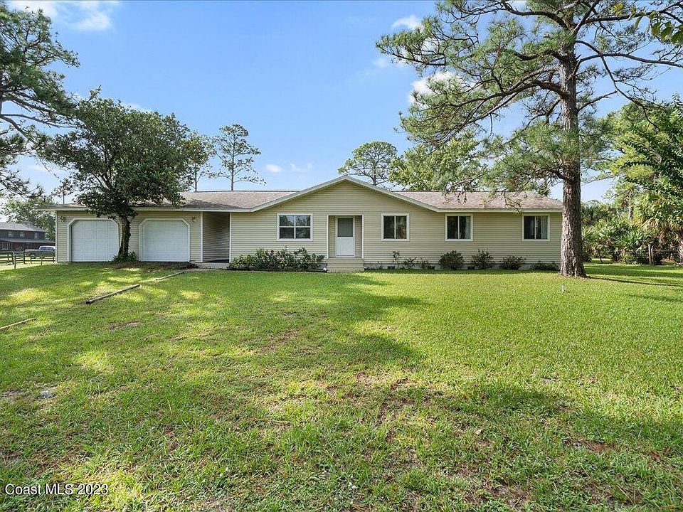 Welcome to this charming oasis, nestled on a sprawling one-acre parcel of land. Discover the comforts of this delightful home with three cozy bedrooms, two full bathrooms, and the convenience of an oversized two-car garage. This home has seen thoughtful upgrades over the years, with a new roof installed in 2019, a water heater replacement in 2022, and the AC system in 2013. With ample room to accommodate all your belongings and playthings, all set within the highly sought-after community of Canaveral Groves, you're about to embark on an exceptional homeownership journey. Located just 42 min from MCO, 20 min to Port Canaveral, and 60 min from Disney.