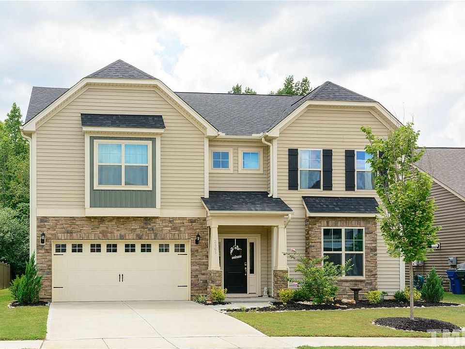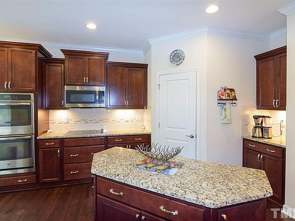 5 B/R, 3 full baths, loft, mud Room, dressing room, 2 walk-in closets in master & sitting rm , sunroom, breakfast room and more! 7th house down from Neuse River Community Deck. Upgrades galore, double oven, electric cooktop, granite counters, crown molding, chair rail, coffered ceiling, tray ceiling, garden tub sep. shower in master bath, multiple linen closets, recessed lighting, tankless water heater, under counter lighting, butlers pantry, walk-in pantry, tile backsplash, fireplace, wood floors etc.