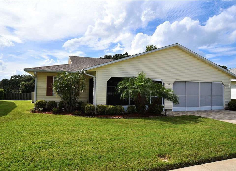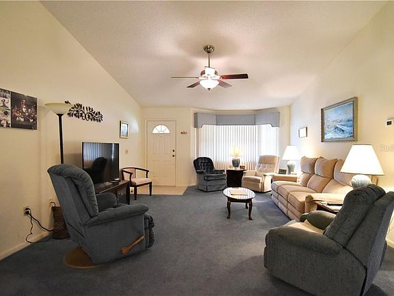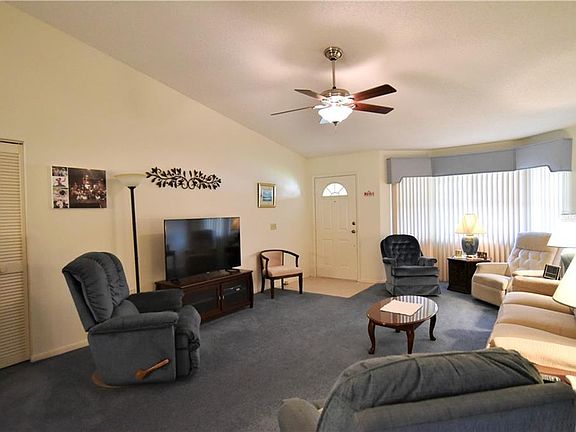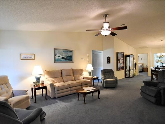 Youll love this open and inviting floorplan! 2 Bedrooms PLUS a Den! Enjoy cooking? Youll love the large kitchen with an eat-in breakfast nook area. Just off the kitchen is a formal dining area for larger gatherings. On the rear of the home, youll enjoy private backyard views from the large windows in the multi-purpose Den. The master suite offers a bath with a large walk-in closet, step-in shower, private water closet and nearly new PVC Plank vinyl flooring. This home has great curb appeal with the addition of a pavered driveway, walk & front screened patio. Bring your golfcart the two car garage offers plenty of parking. The A/C was replaced in 2015. This home has been well maintained and is move-in ready! Enjoy all the amenities which includes lawncare, Cable TV, Interenet & WiFi for only $198 per month! Beautiful clubhouse, pool, tennis, clubs and games galore! Never a dull day in this Community! Great location with Publix, restuarants & more just across the street and approx. 1 mile to Interstate 4 access. Community is gated and features a Private Executive Golf Course.
