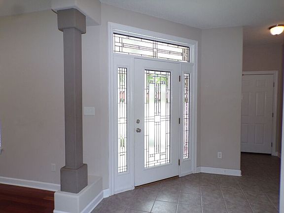 A side-entry driveway leads to the covered front porch and decorative glass entry door. Inside, the foyer opens to a formal dining room highlighted by elegant decorative columns. The great room boasts warm hardwood floors and large windows overlooking the covered, screened-in porch and expansive backyard. A tiled fireplace framed by lighted art niches serves as the focal point of the room. The kitchen is both functional and stylish, featuring Silestone countertops, custom maple cabinetry, a breakfast bar, pantry, dual-basin undermount sink, and stainless steel appliances, including a side-by-side refrigerator, dishwasher, flat-top range/oven, and built-in microwave.