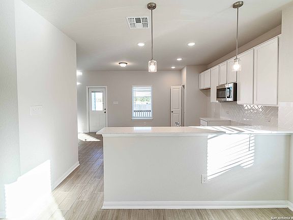 Charming one story Frio plan with 3 bedrooms and 2 baths. Huge family room! Kitchen has all the goodies with quartz counters, 42" cabinets, and stainless steel appliances. Super shower in master bath with dual vanities and elongated commode. Large walk-in closet in master and secondary bedroom. Backyard includes covered patio perfect for relaxing. Home includes many more additional features such as full sod, sprinkler system, blinds, and pre-plumb for water softener!