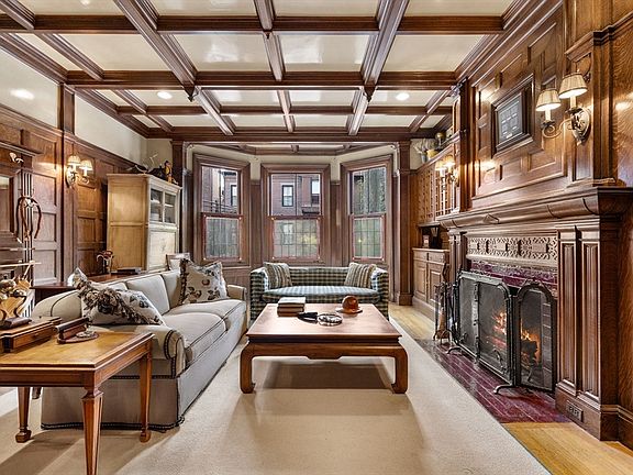 Experience the epitome of Back Bay living in this meticulously crafted three-floor residence. Period details harmonize with bespoke customizations for unparalleled elegance. An elegant foyer with a custom-built staircase leads to the formal living room with paneled millwork, 11-foot coffered ceilings, and expansive bay windows. The gourmet kitchen features a La Cornue gas range and Miele/Sub-Zero appliances, adjacent to a refined dining area with custom pantry storage. Upstairs are two spacious bedrooms with high ceilings, fireplaces, and generous custom closets, along with a luxurious bath. The lower level offers a media room, wine cellar, and sunlit guest suite or office with private bath and kitchenette. A Tuscan-style patio with reclaimed stone and a limestone fireplace provides outdoor living, with direct access parking and a private entrance.