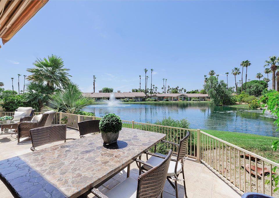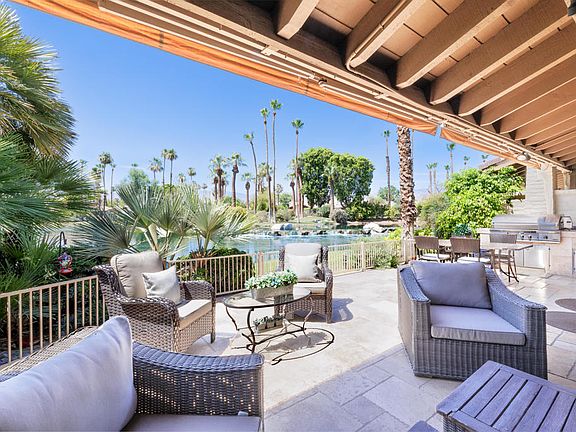 Exquisitely Upgraded & Turnkey Furnished Lakeside Retreat | 2 Ensuite Bedrooms + Ensuite Den | 3.5 BathsEvery inch of this beautifully renovated, south-facing Laramie model has been thoughtfully designed to impress even the most discerning buyer. Fully furnished and move-in ready, this lakeside residence offers an exceptional blend of luxury, comfort, and breathtaking desert living.Curb appeal begins with a paver brick driveway and custom etched-glass front door, setting the tone for the elevated design throughout. Inside, you'll find solid raised-panel doors and frosted glass doors on closets and bathrooms--blending modern sophistication with natural light and architectural interest.Step inside and experience a refined interior where no detail has been overlooked--from floor to ceiling, the finishes are elegant, modern, and cohesive. The open-concept great room and kitchen are framed by expansive windows and sliding glass doors that fill the space with natural light and showcase panoramic views of the lake, cascading waterfall, and dramatic mountain backdrop.The extended, tiled back patio provides a serene setting perfect for soaking in the sun, entertaining guests, or simply relaxing to the tranquil sounds of the water. Indoors, the kitchen is a showpiece: outfitted with stainless steel appliances (including a wine fridge), updated cabinetry with newer stainless hardware, and exquisite Bianco Antico granite countertops with a full matching backsplash. Lighting has been thoughtfully upgraded throughout to enhance both function and ambiance.A wall was removed between the kitchen and great room to create seamless flow and conversation-friendly counter seating. Each bedroom offers comfort and privacy, and all bathrooms have been updated to reflect the same attention to quality and design. The large, ensuite den offers profound flexibility - an ideal space for an in-home office, artist studio, game room, or extra bedroom. This is more than a home--it's a lifestyle. Whether you're seeking a serene retreat, a full-time residence, or a spectacular seasonal escape, this exceptional home combines modern upgrades with an unbeatable lakeside setting. (See attached Upgrades List).The Lakes CC offers an extensive array of homeowner amenities, incl tennis, pickleball, fitness, exquisite clubhouse, casual and fine dining, and more. Centrally located, close to shopping, Acrisure Arena, and the renowned El Paseo.