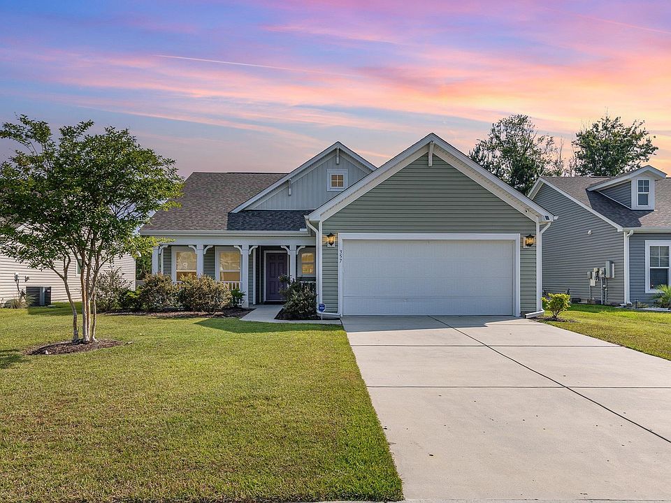 Welcome to your dream home in the Surfside Plantation Community! This stunning home boasts 3 bedrooms, 2 bathrooms, and a bright Carolina room. Enjoy the pond views and the convenience of being just steps from the community pool and minutes from the beach, golf courses, shopping, and restaurants. Inside, you'll find a beautiful open floor plan. The kitchen features stainless steel appliances, and an extended countertop breakfast bar. A vaulted ceiling enhances the dining and great room areas, providing an airy, spacious feel. The large owner's suite includes a large bathroom with a walk-in tiled shower, double sinks, and a spacious walk-in closet. The Carolina room at the rear of the home, with its sliding glass door, opens to a covered porch with an extended concrete patio that leads to the backyard that overlooks the beautiful pond. With ample closet space throughout and a 2-car garage, you'll have plenty of room for storage and vehicles. Surfside Plantation is a natural gas community, offering a natural gas range/oven, hot water heater, furnace, and an additional gas line to the rear yard. This home is a must-see! Schedule a showing today and seize the opportunity to own a great home in an awesome neighborhood!
