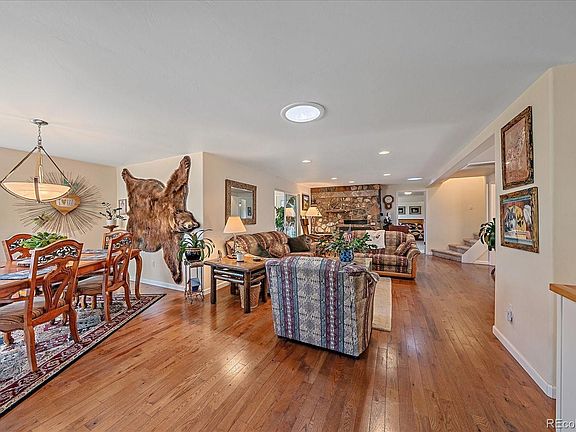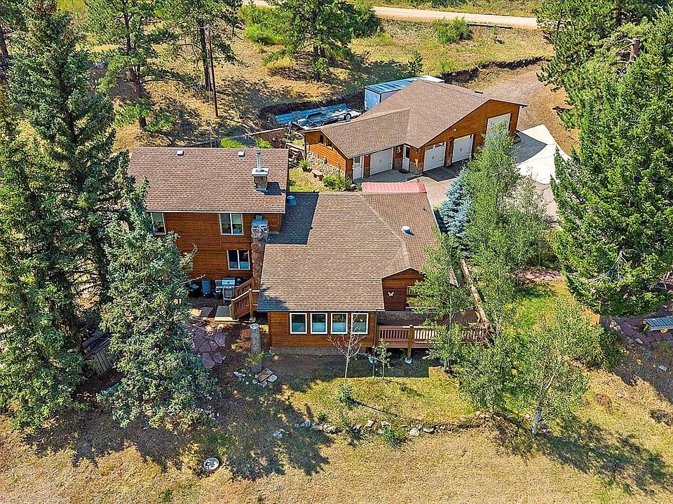 Discover wide open spaces and breathtaking views in this beautifully updated 3-bed, 3-bath mountain contemporary on 2.15 level acres in Shawnee. With 2,389 finished sq ft, this home blends comfort and function with hardwood and tile floors, a stone fireplace with wood-burning insert, and a spacious kitchen with gas range. Enjoy a cozy heated-floor TV room, a main-level primary suite with walk-in closet, and flexible upstairs space with 2 bedrooms plus an office. All interior features were updated in 2008. Outdoor living is a dream with a deck, fire pit, pergola, flagstone patio, and horseshoe pit. Abundant wildlife, mountain scenery, and privacy—just minutes from Pine Junction and Conifer. A welcoming neighborhood completes the package. Car enthusiasts will LOVE the attached 4-car garage and **HEATED OVERSIZED GARAGE WITH 5-CAR CAPACITY!** TANDEM PARKING, AIR COMPRESSORS, AND INCLUDED 9K LB RACK, PLUS A HEATED MAN CAVE AND STORAGE SHED. THERE'S ALSO A PAVED DRIVEWAY AND RV PARKING! Detached garage has spray foam insulation in addition to R30. Heated by a separate propane tank with an infrared ceiling heater and its own separate electricity meter. Conveniently wired for 220 so there is welding capability. Includes a 28 ft wide, 16 ft deep and 10 ft high (apx) LOWER-LEVEL WALK-OUT. In addition, a LEAN-TO has been added on the east side of the building, complete with spray foam insulation and a FLOOR-DRAIN SYSTEM. A new 1200-gallon septic system has just been added as of 11/8/25. There's so much to see here!! View the pictures and virtual tour, then call for your personal showing!